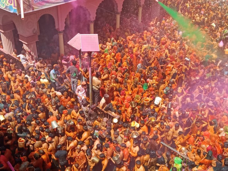 मंदिर प्रांगण में जैसे ही हुरियारिनों ने हुरियारों के कपड़े फाड़कर कोड़े बनाए, माहौल उल्लास और मस्ती से भर उठा। इसके बाद हुरियारों पर प्रेम के प्रतीक इन कोड़ों की बरसात शुरू हो गई। श्रद्धालुओं ने इस अनूठी परंपरा का आनंद लिया और मंदिर परिसर में जमकर नृत्य किया। भीड़ इतनी अधिक थी कि पूरा प्रांगण खचाखच भरा हुआ नजर आया। हुरियारे भी इस प्रेमपूर्ण प्रहार का आनंद उठाते हुए बोले, “ये तो फूलों की मार पड़ रही है!”